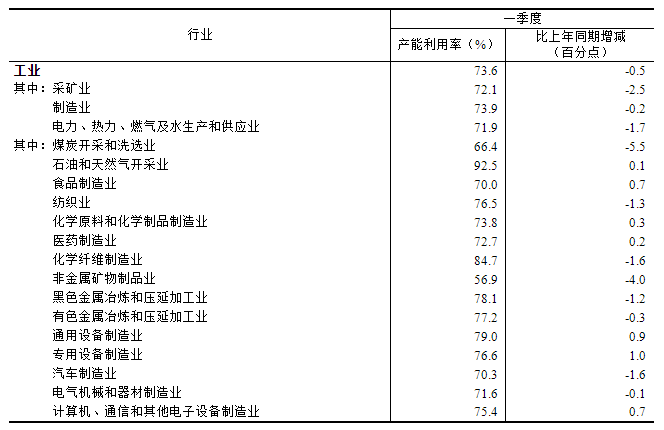 2026年一季度,全国规模以上工业产能利用率为73.6%,比上年四季度下降1.3个百分点,比上年同期下降0.5个百分点。