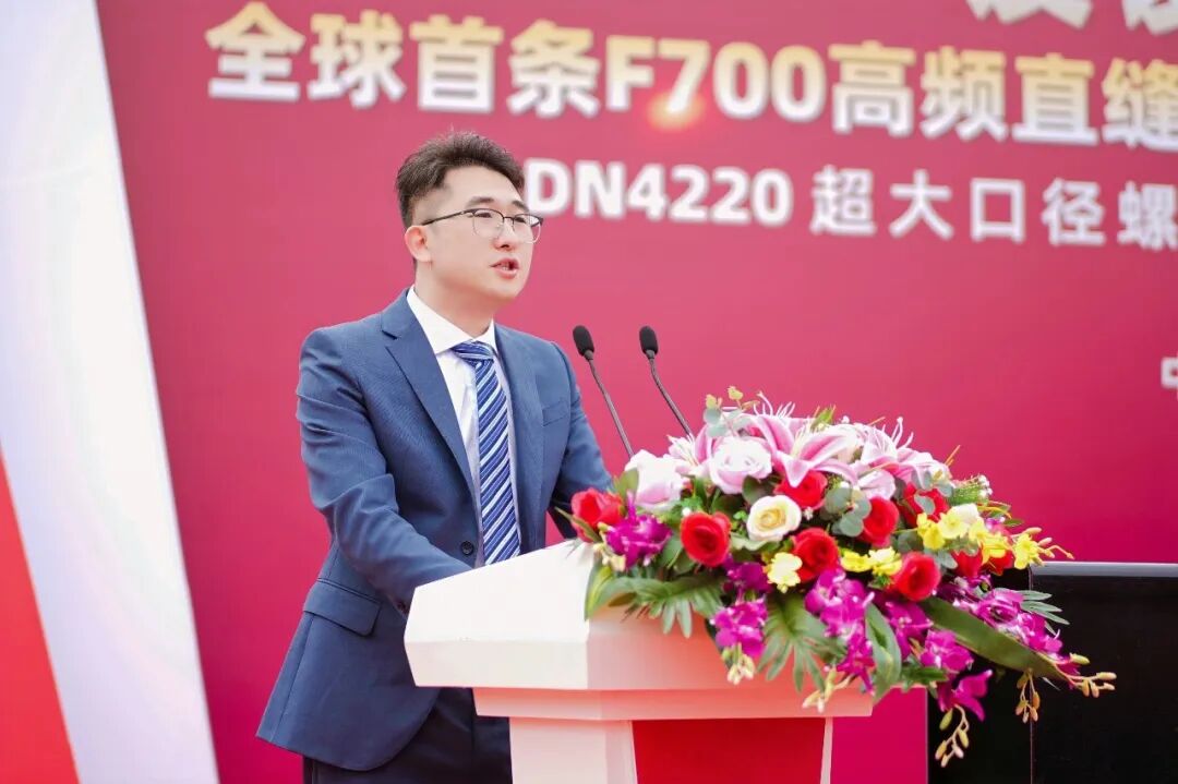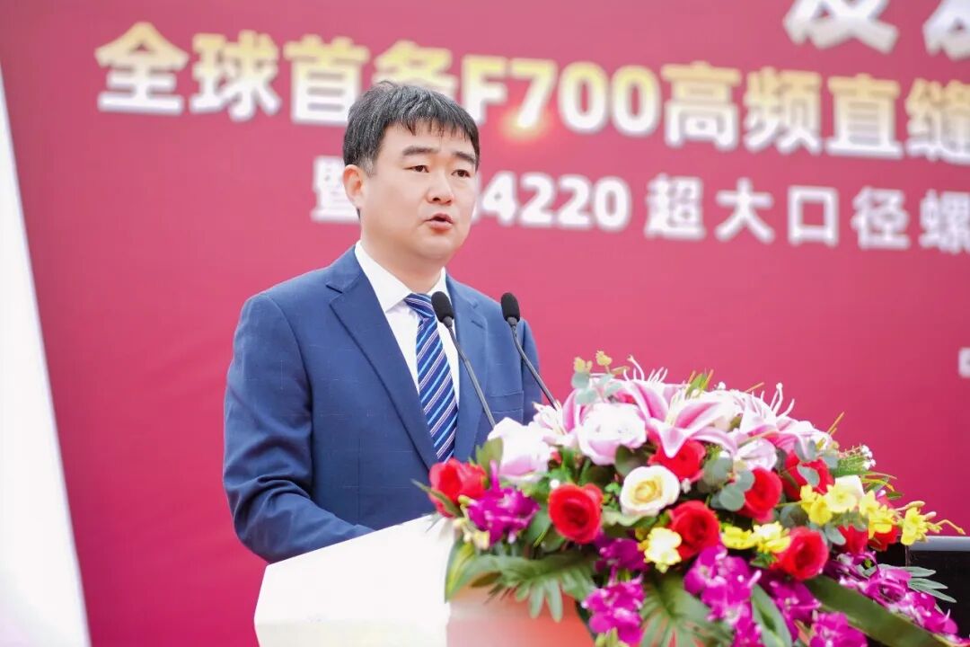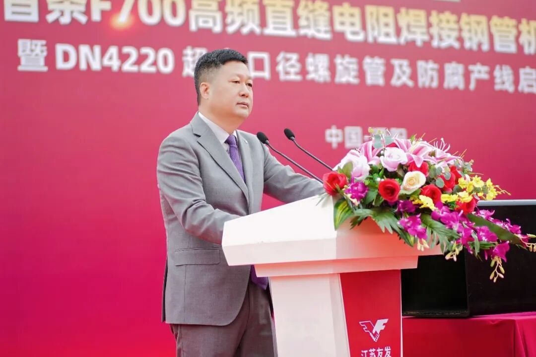 江苏友发大客户服务中心营销总监袁磊上台致辞。他立足市场一线,精准解读当前钢结构、市政工程、消防管道等领域对大口径、高规格、高品质管材的迫切需求,点明行业现存的规格瓶颈、性能短板等核心痛点。他强调:本次启动的 F700高频直缝电阻焊接钢管机组,作为全球唯一、规格顶尖的直接成型焊接方矩管产线,将彻底填补国内大口径方矩管产能空白,将让江苏友发从 “卖产品” 向 “卖服务、卖价值、卖方案” 全面转型,全力赋能经销商与终端客户降本增效,实现互利共赢。
