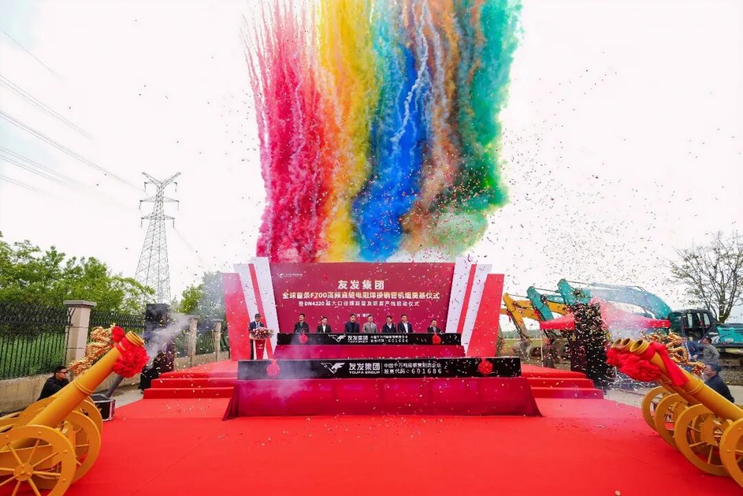 全场齐声倒数:3、2、1!启动!随着嘉宾共同敲击方管,礼炮齐鸣、工程机械鸣笛致意、全场掌声雷动!全球首条 F700高频直缝电阻焊接钢管机组暨DN4220超大口径螺旋管及防腐产线正式启动,江苏友发迈入全球领跑新阶段!