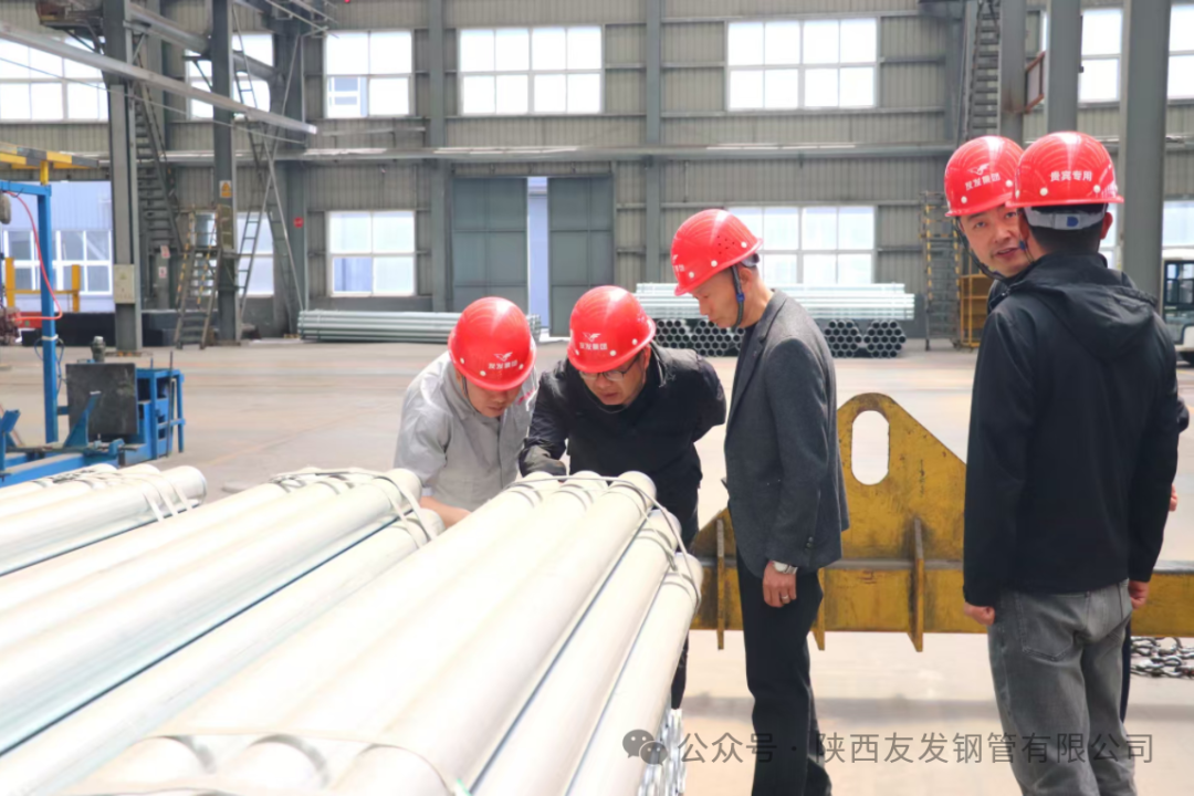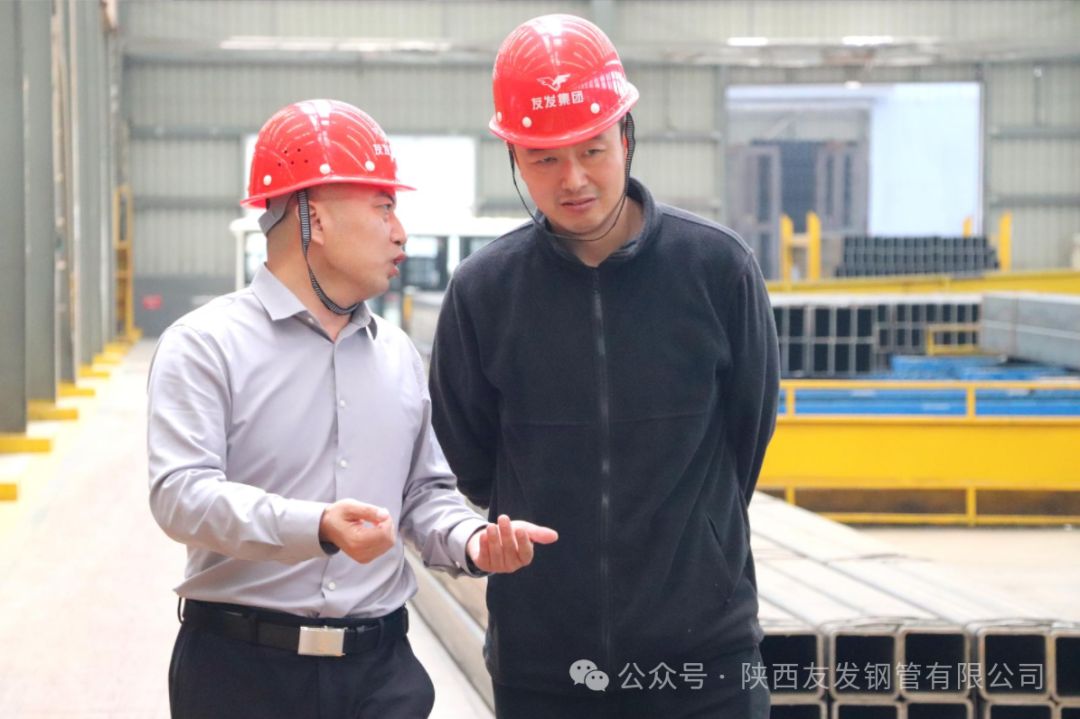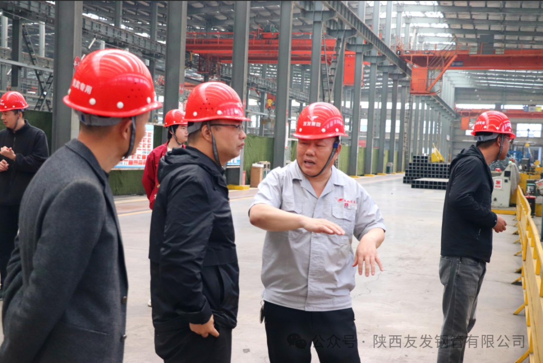 考察期间,先后深入生产车间、成品仓储区等核心区域,实地考察生产线运行状况、产品制造全流程管控、质量检测体系及安全生产管理细节。郝总详细介绍陕西友发的企业发展历程、生产规模、技术创新成果、质量管理体系建设及在钢管制造领域的专业优势,从原材料入厂检验、生产过程精细化把控到成品出厂严格检测的全链条质量保障机制,全面展现了陕西友发标准化、规范化、精细化的生产管理模式和过硬的企业实力。